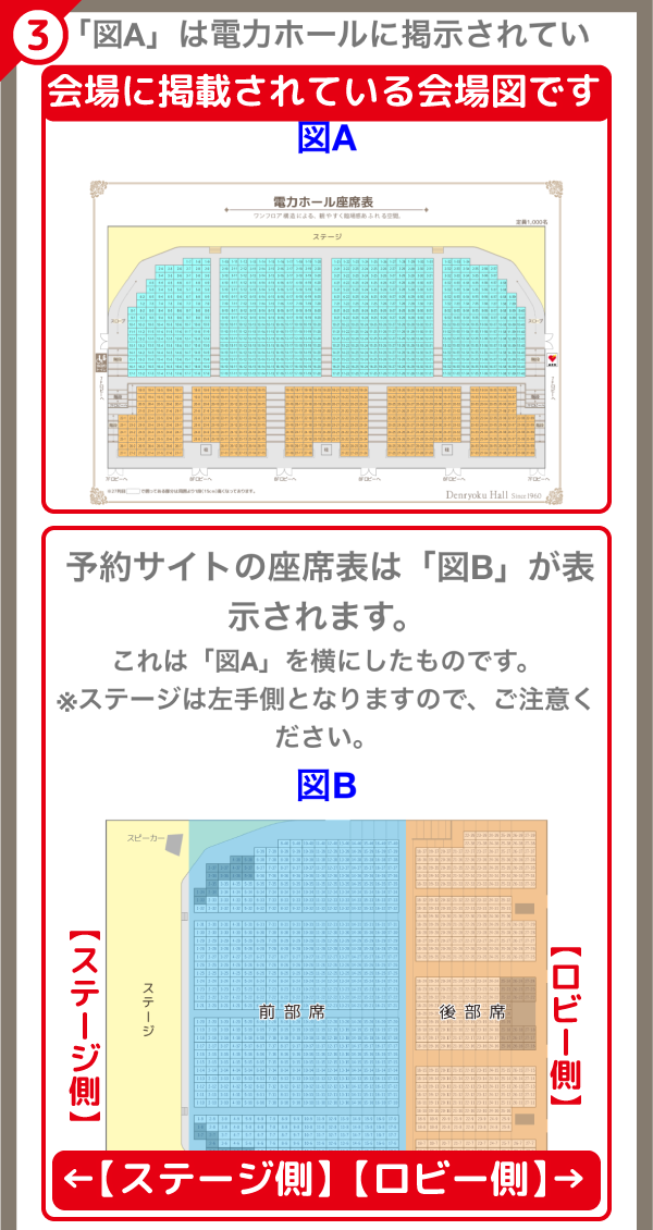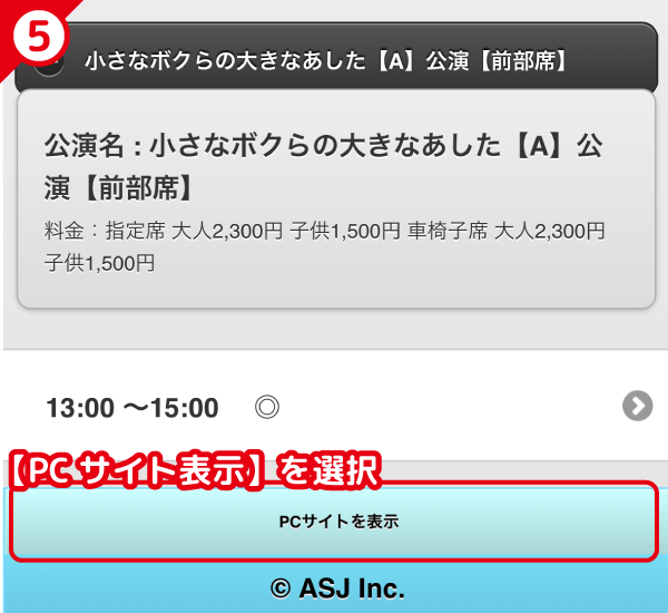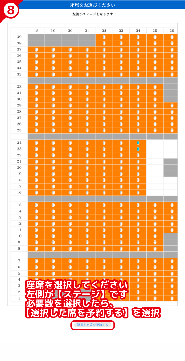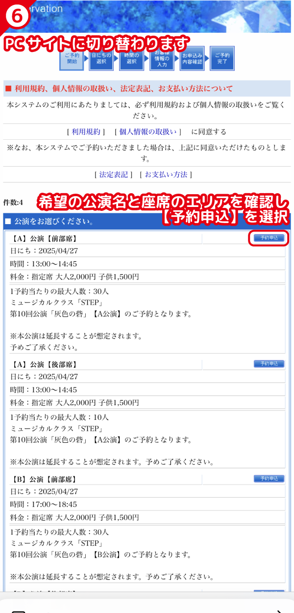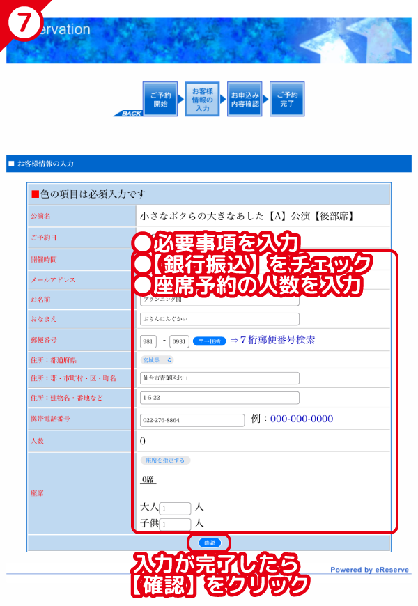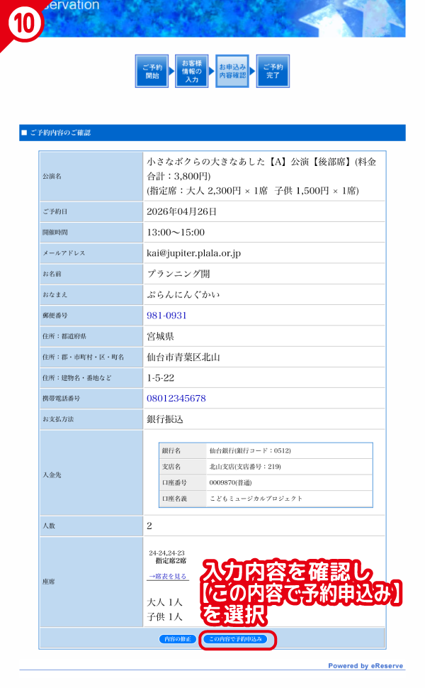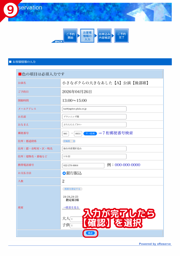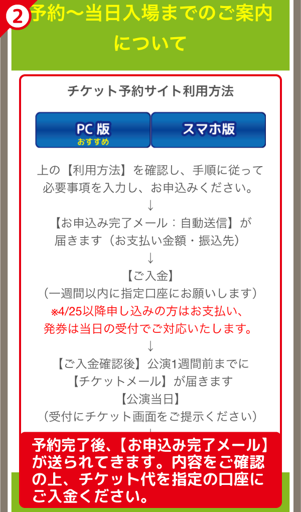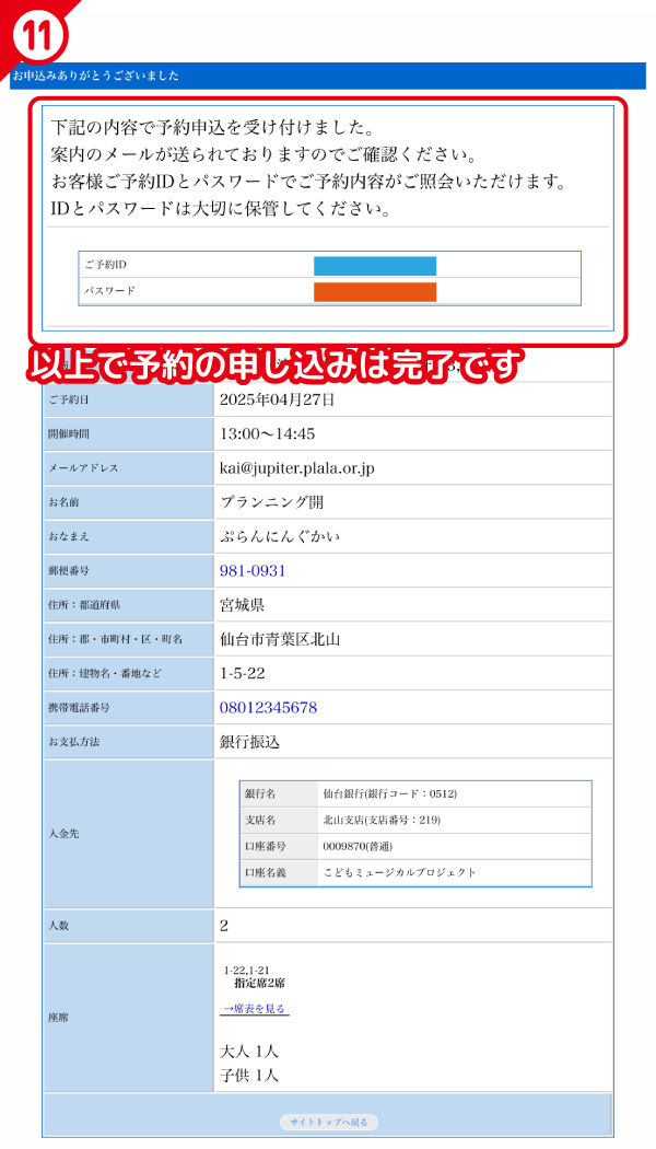 予約方法:PC版(おすすめ) チケットの予約から当日までの 流れです 確認してください 以上でお申し込みは完了です。 自動送信で【お申し込み完了メール】が届きます。 ご入金金額とお振込み口座をご確認の上、「予約番号と予約者名」でお振込みください。 ※例(123 佐藤一郎) ※尚、【ご予約ID】と【パスワード】はキャンセルやお申込みの確認の際に必要となりますメモ等で保管ください 【座席予約時のメール設定】 座席予約のお申し込み前に、フィルタリング設定の見直しをお願いいたします。 受信許可リストに以下のメールアドレスをご登録ください。 「no-reply@seat-reserve.jp」「musical-step@kodomono-oka.com」 「お申込み完了」メールが届かない場合こちらへご連絡ください。
