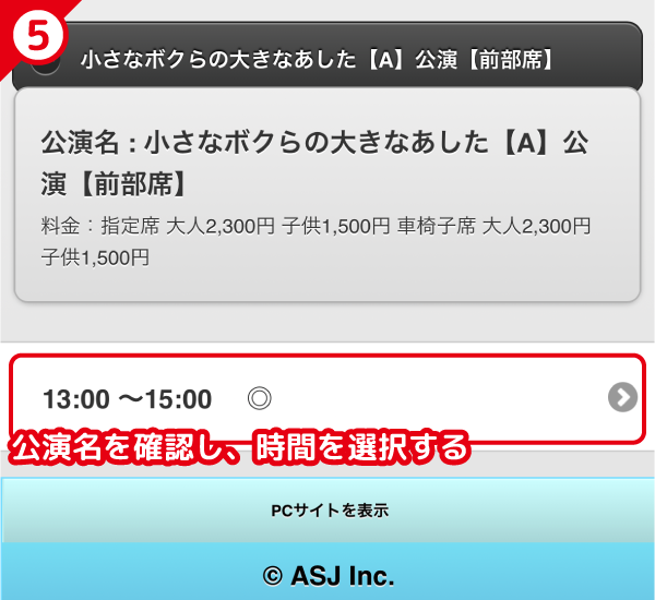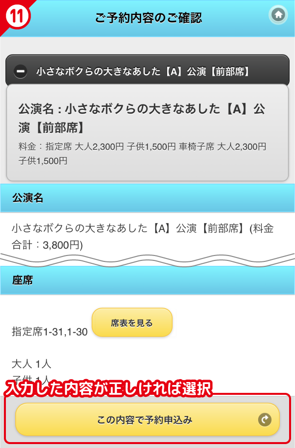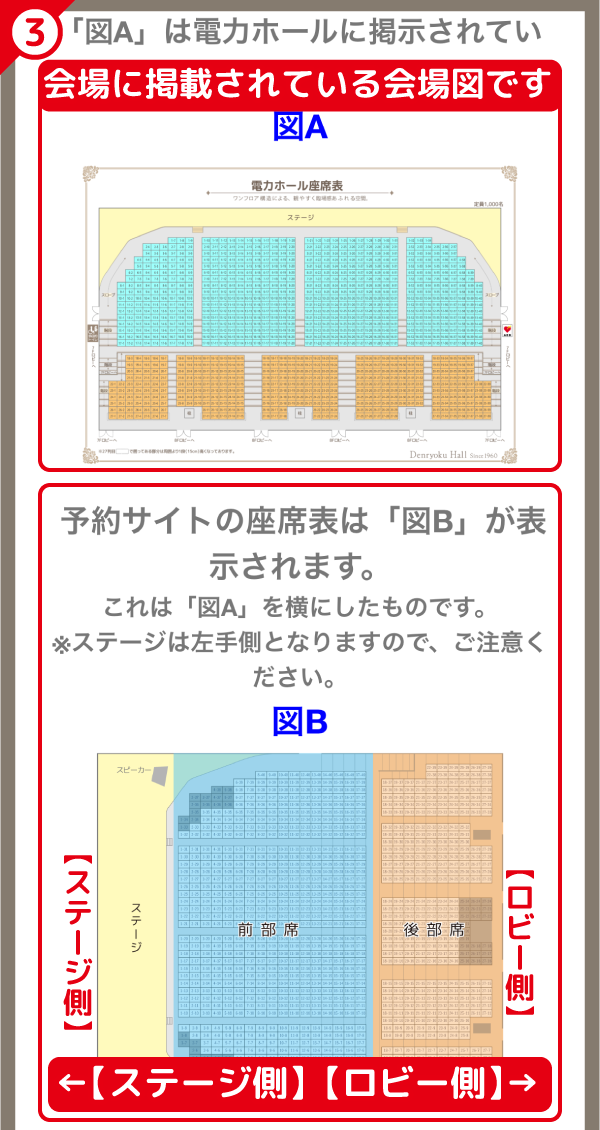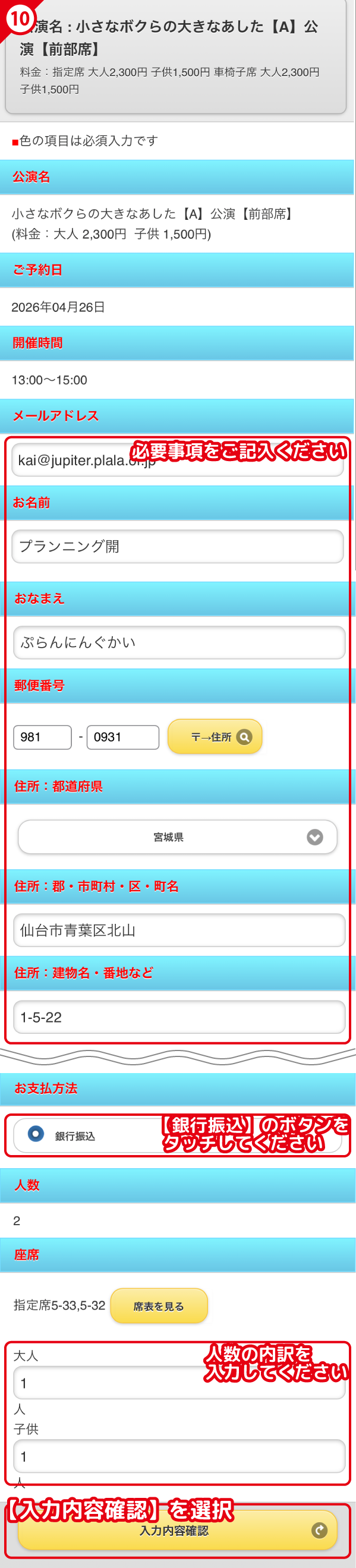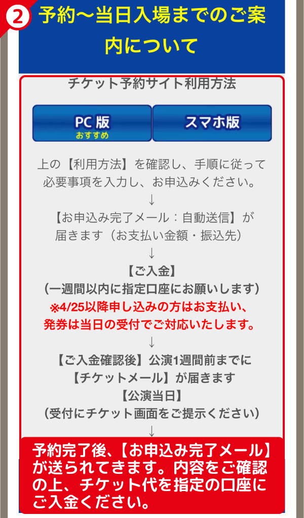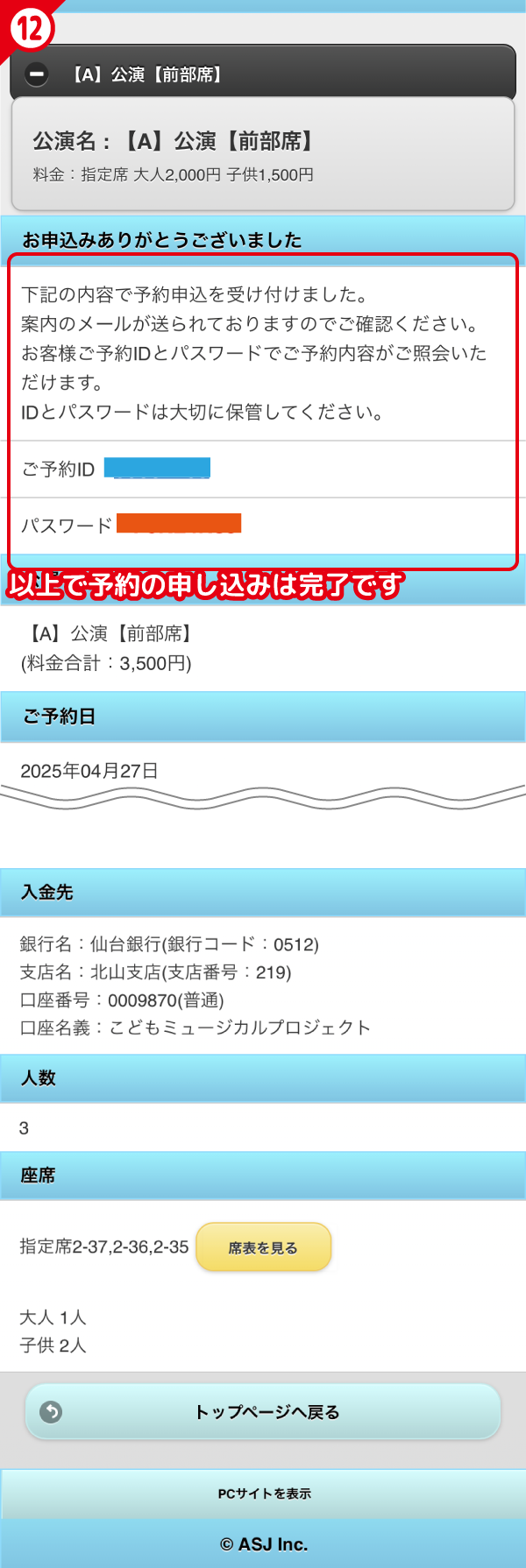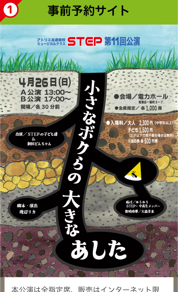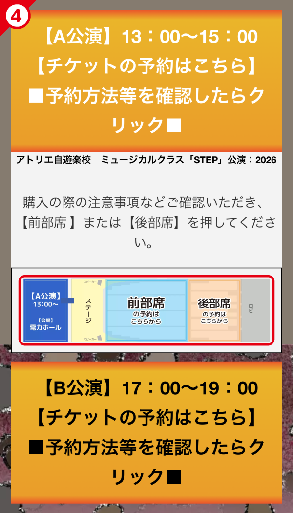 予約方法:スマートフォン版 チケットの予約から当日までの 流れです ご確認ください 【前部席】または【後部席】を選択 座席を選択してください ←左が【ステージ側】です 希望の席を選択したら、【予約する席の決定】を選択 以上でお申し込みは完了です。 自動送信で【お申し込み完了メール】が届きます。 ご入金金額とお振込み口座をご確認の上、「予約番号と予約者名」でお振込みください。 ※例(123 佐藤一郎) ※尚、【ご予約ID】と【パスワード】はキャンセルやお申込みの確認の際に必要となりますメモ等で保管ください 【座席予約時のメール設定】 座席予約のお申し込み前に、フィルタリング設定の見直しをお願いいたします。 受信許可リストに以下のメールアドレスをご登録ください。 「no-reply@seat-reserve.jp」「musical-step@kodomono-oka.com」 「お申込み完了」メールが届かない場合こちらへご連絡ください。